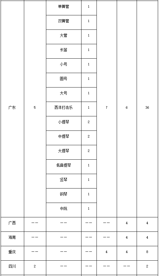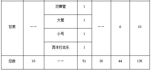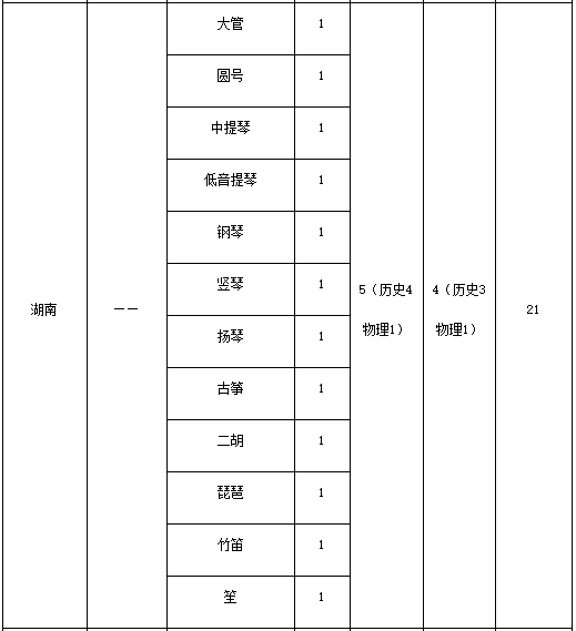 仅招小提琴、中提琴、大提琴、低音提琴、长笛、单簧管、双簧管、大管、圆号、小号、长号、大号、竖琴、西洋打击乐(仅招马林巴或小军鼓)、钢琴、二胡、琵琶、中阮、竹笛、笙、扬琴、古筝。