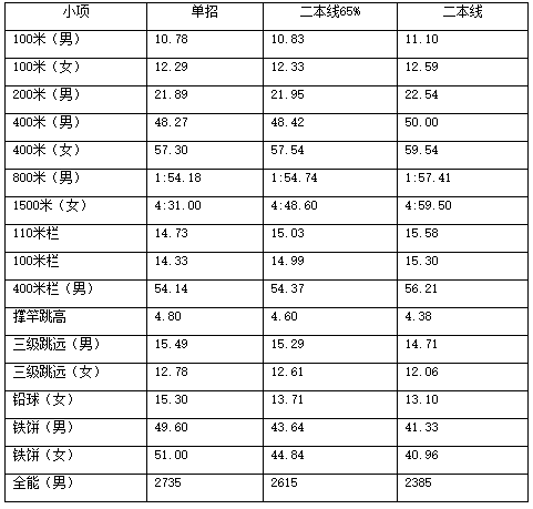 表2 田径项目各类别考生的资格认定最低测试成绩要求